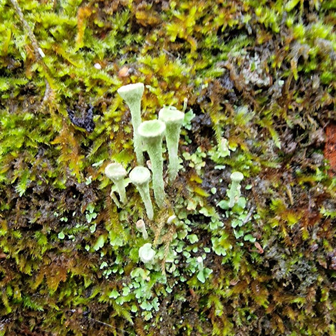 A "hanging garden" of Cladonia sp. lichen, probably C. coniocrea, on wood stump